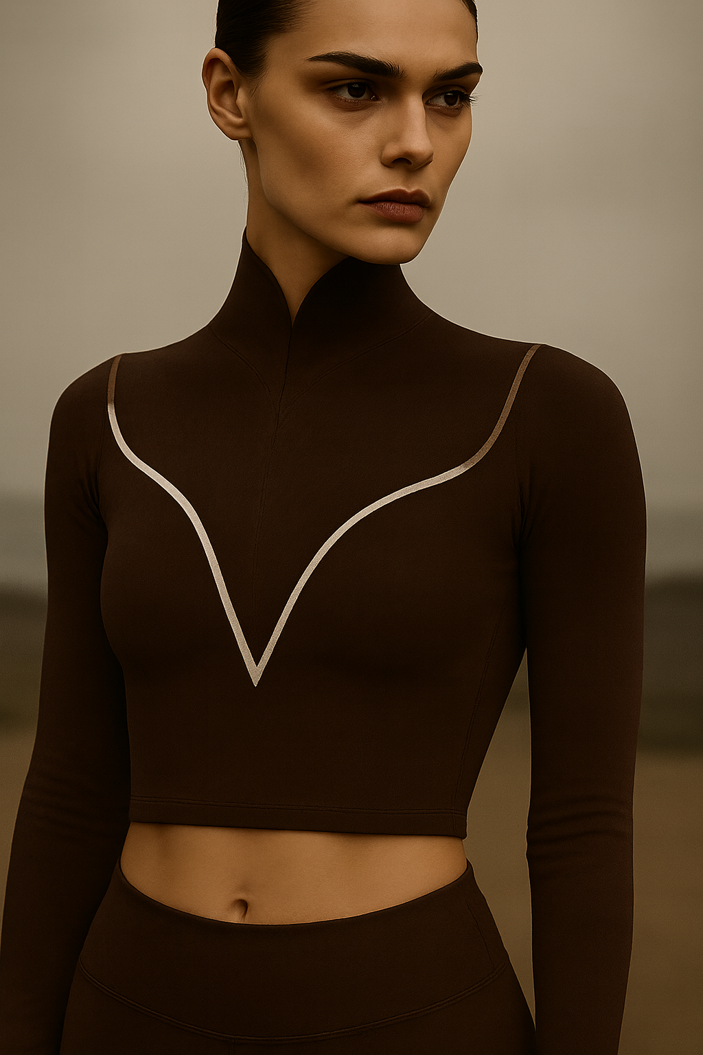 The queen top is designed to embody quiet strength. This long-sleeve crop top features a structured high neck and an elegant V-shaped line that follows the natural architecture of the body.